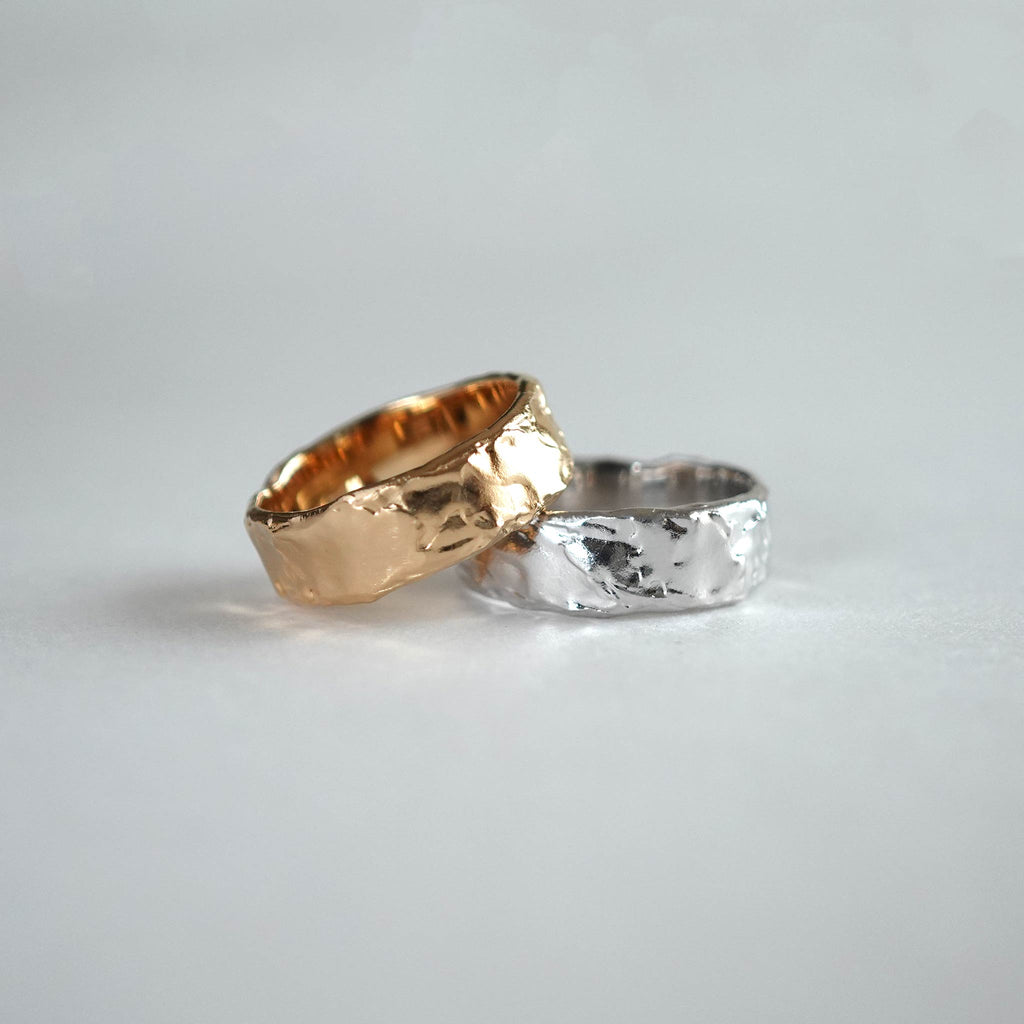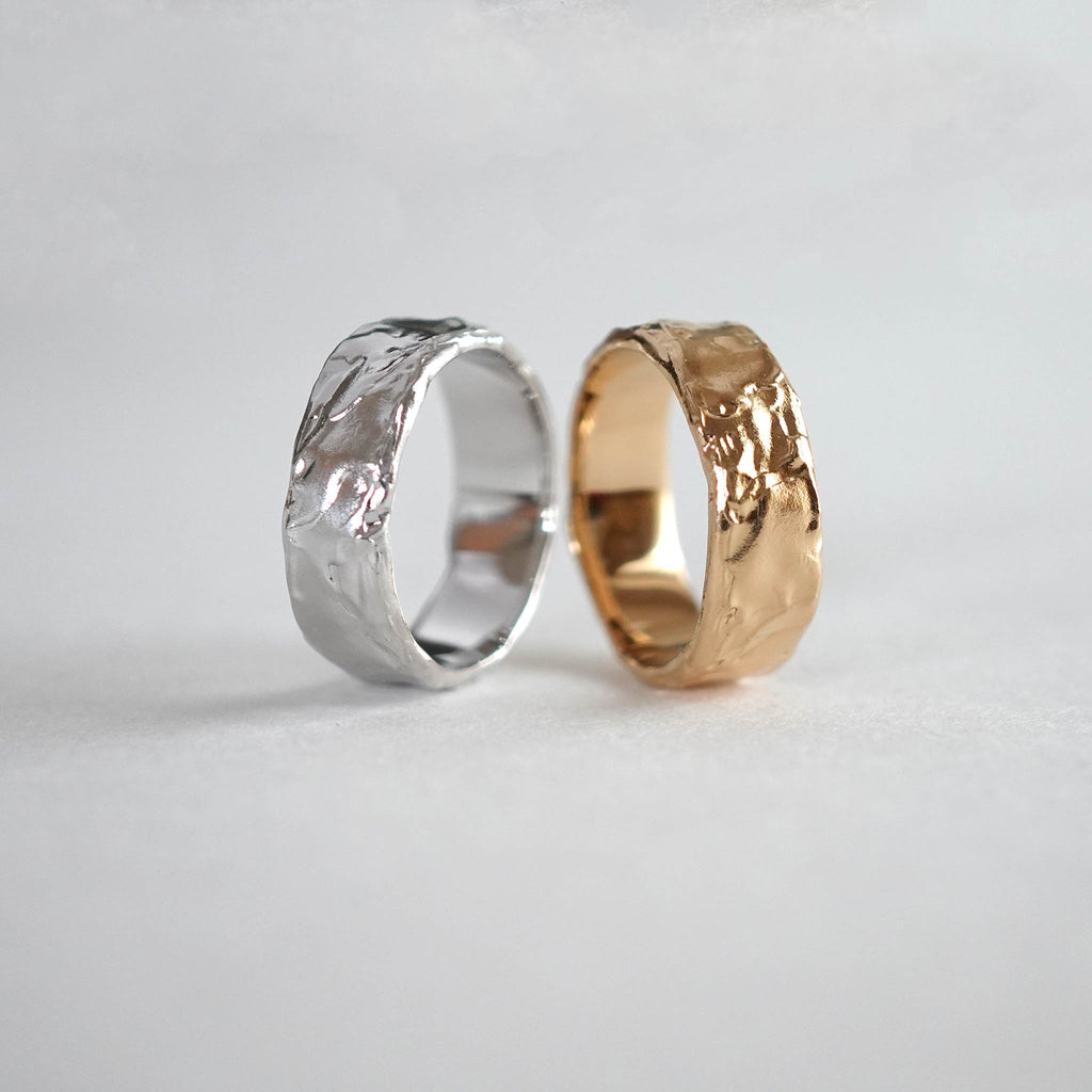 ゆらめきの中にも堅牢さを感じさせる、ボリューム感のあるワイドリング。柔らかな表情は常に表情を変え、永く使っても飽きることがありません。使い込むほどに柔らかな艶が増してしっとりと身体に馴染んでいきます。ユニセックスアイテムとしてもおすすめ。