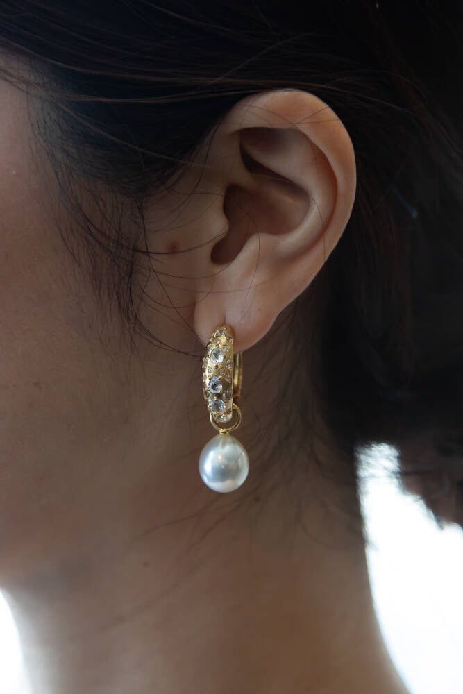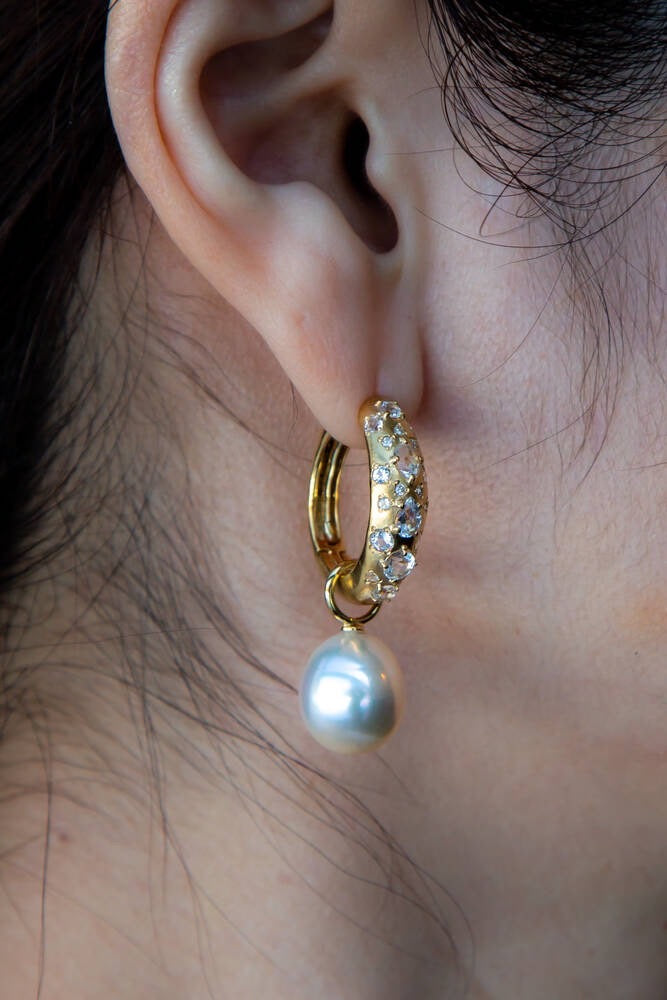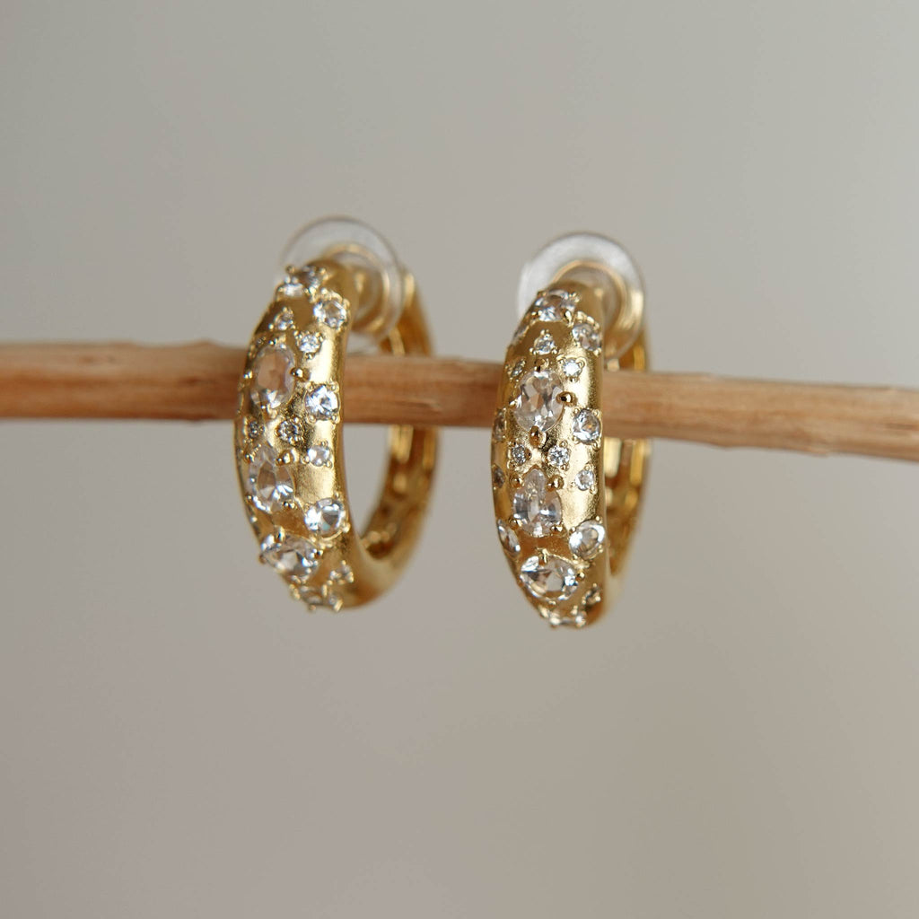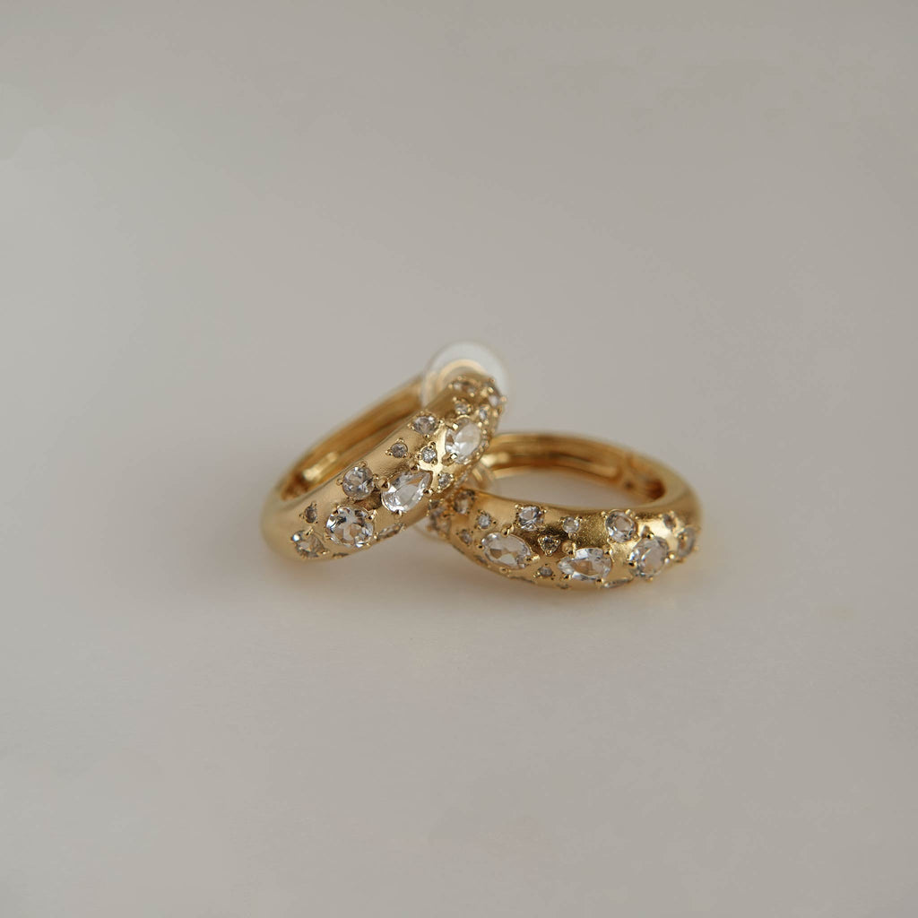 ボリューミーなフープにホワイトカラーの宝石を散りばめ、華のあるジュエリーに仕立てました。ダイヤモンド、サファイア、トパーズのそれぞれ微妙に異なる色味と輝きが、クラシックな装いをアップデートします。