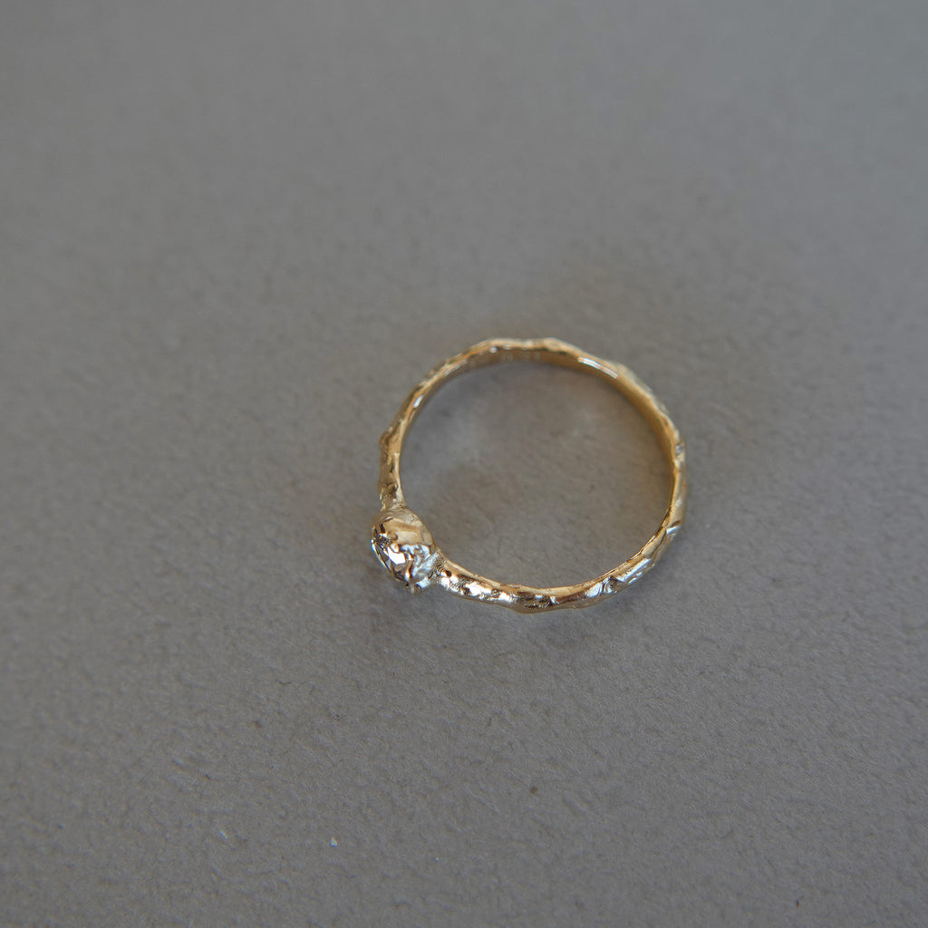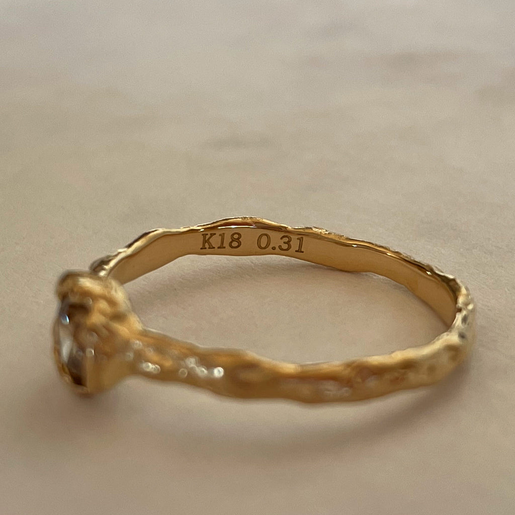 透明感ある輝きがダイヤモンドらしいシャンパンカラーのルース。シンプルながら質感豊かなゴールドの枠に埋めるように留め、タイムレスなデザインに仕上がりました。