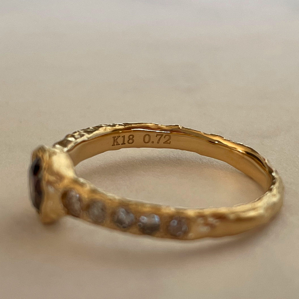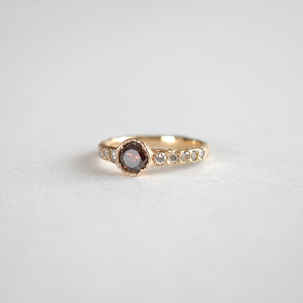 コニャックと呼ばれるに相応しい、蒸留したような深い赤みが特徴のダイヤモンド。石の美しさが一層際立つハーフエタニティに仕立てました。クラシックなムードも漂う一品です。