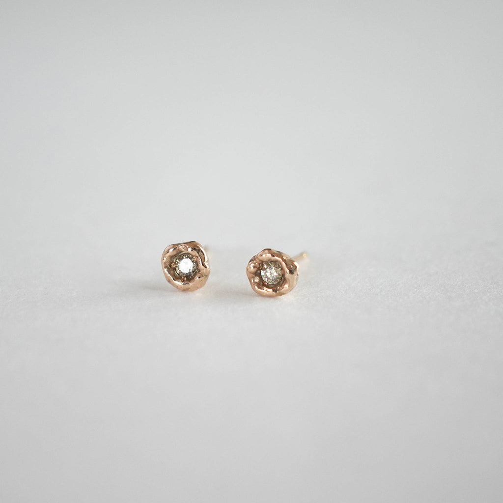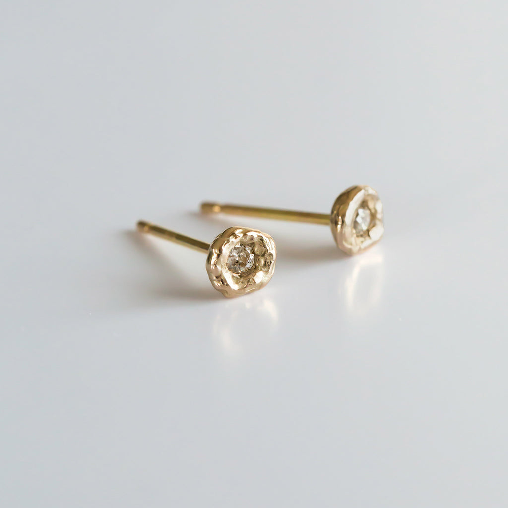 柔らかな質感のゴールドに囲まれた石は、主張しすぎず控えめに輝きます。金の合金の中でもっとも硬い10金と、鉱物の中で最高の硬度を誇るダイヤモンドで作った、タフでソフトなジュエリー。