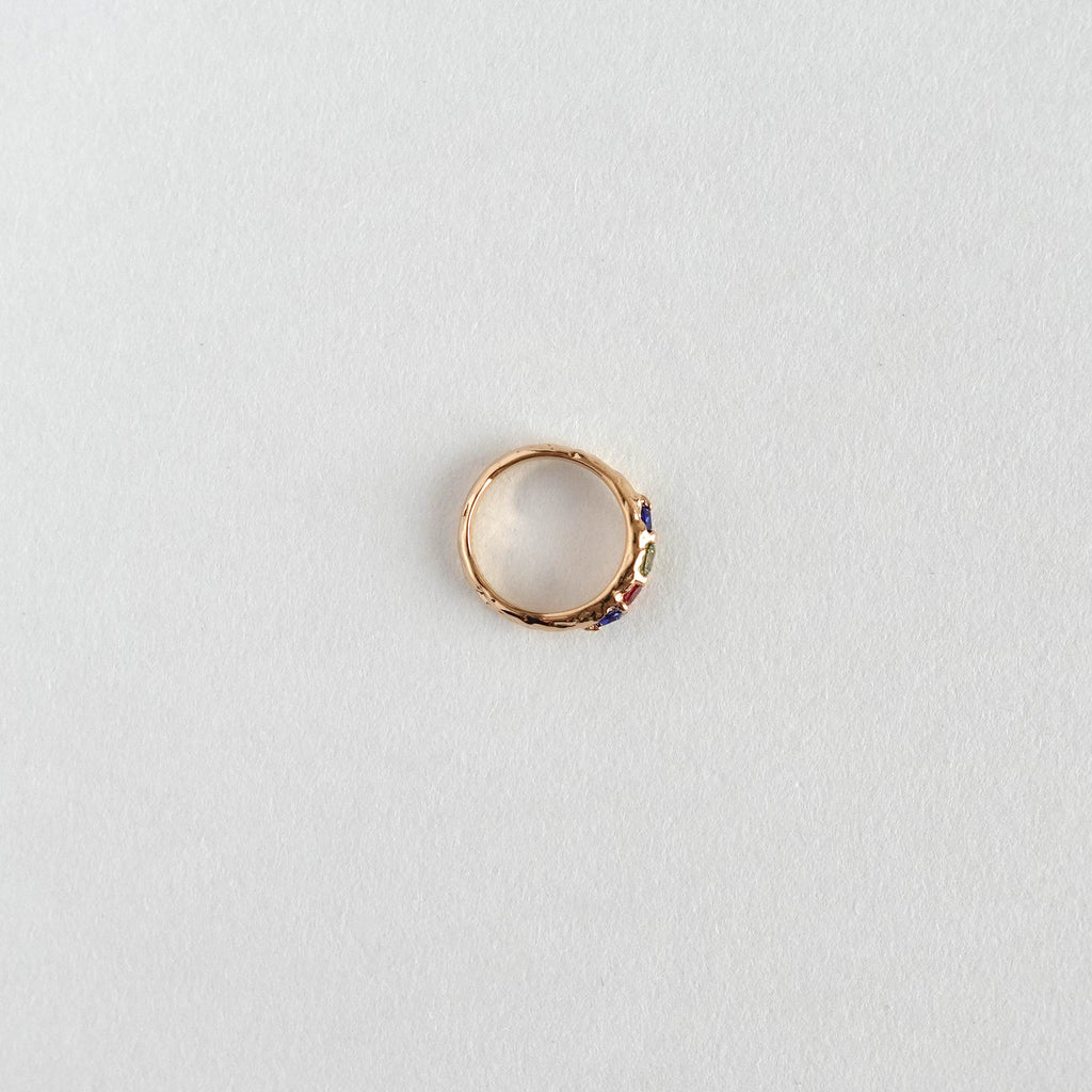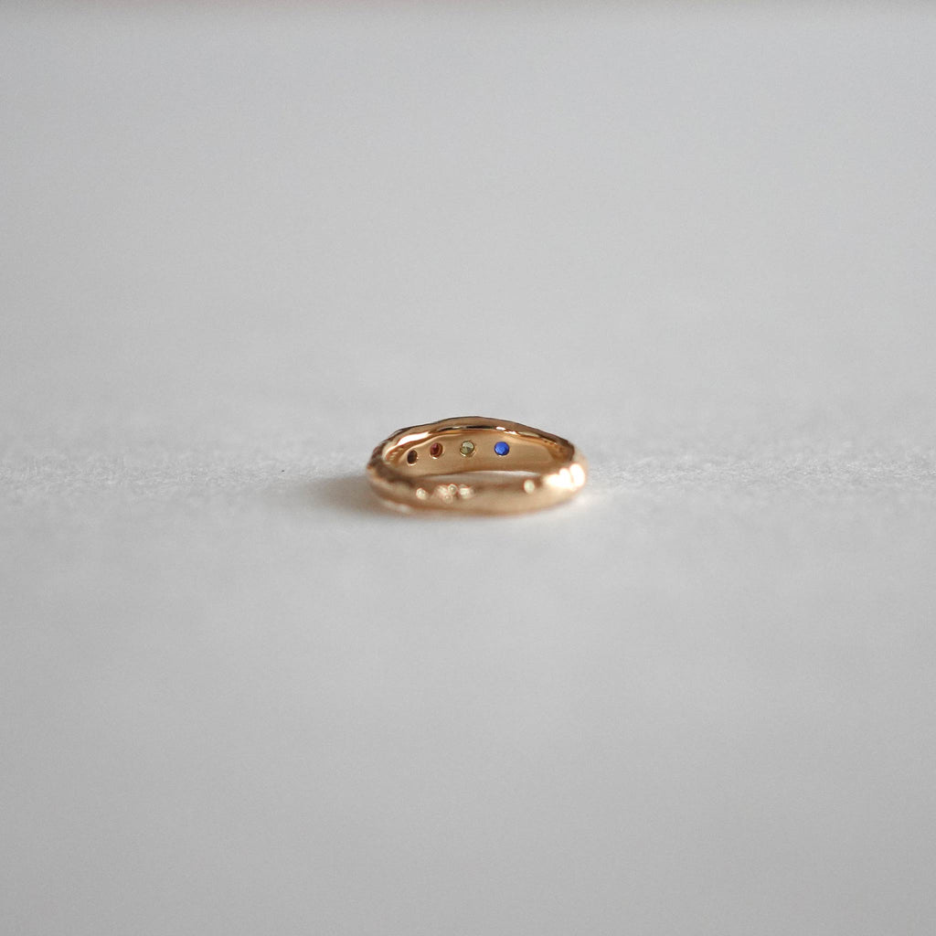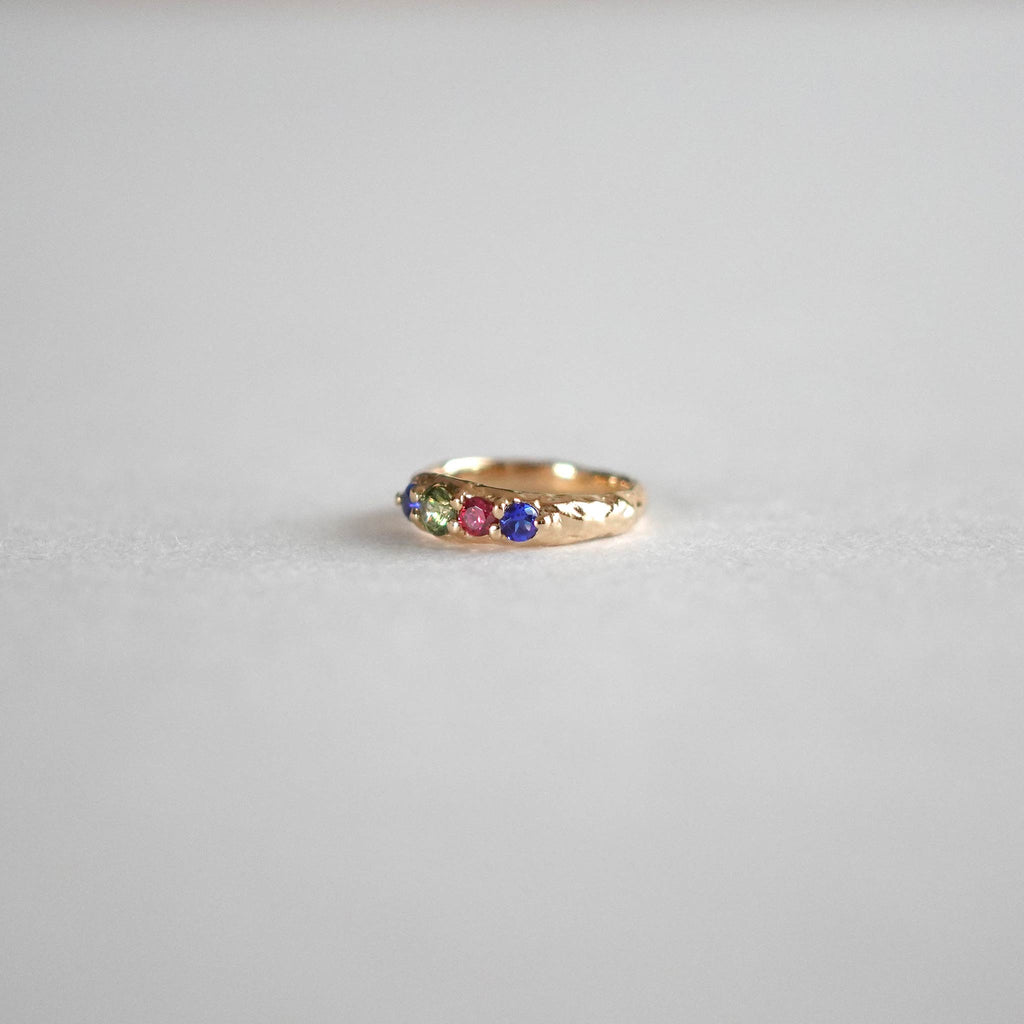 デザイナーが自身の子どもへの贈り物としてデザインしたベビーリングです。メインストーンに赤ちゃんの誕生石を、その左右に家族の誕生石をあしらった、シンプルながら本格的なファーストジュエリー。