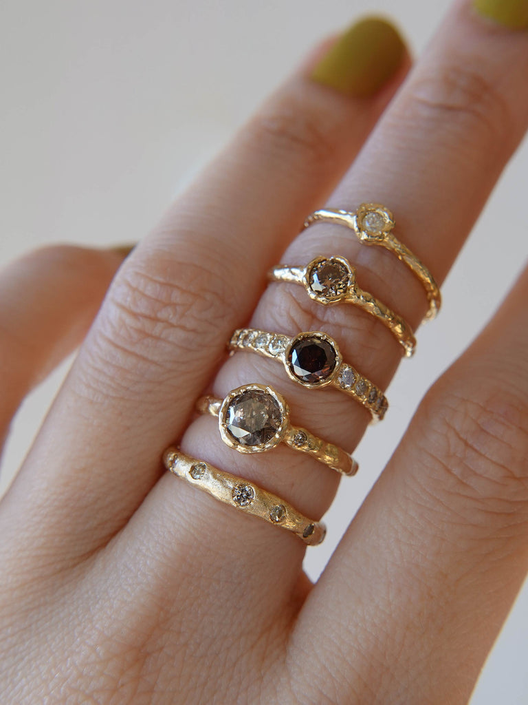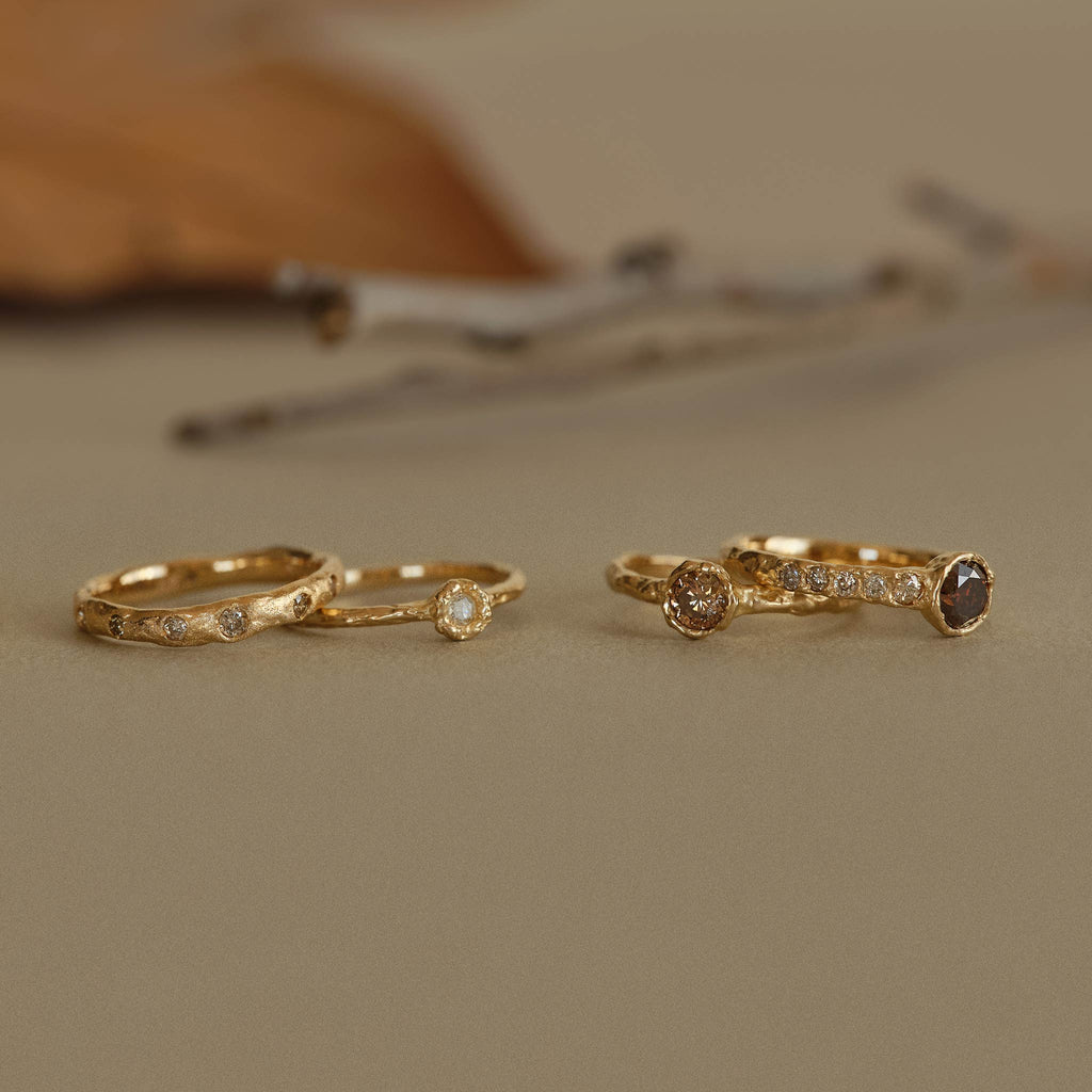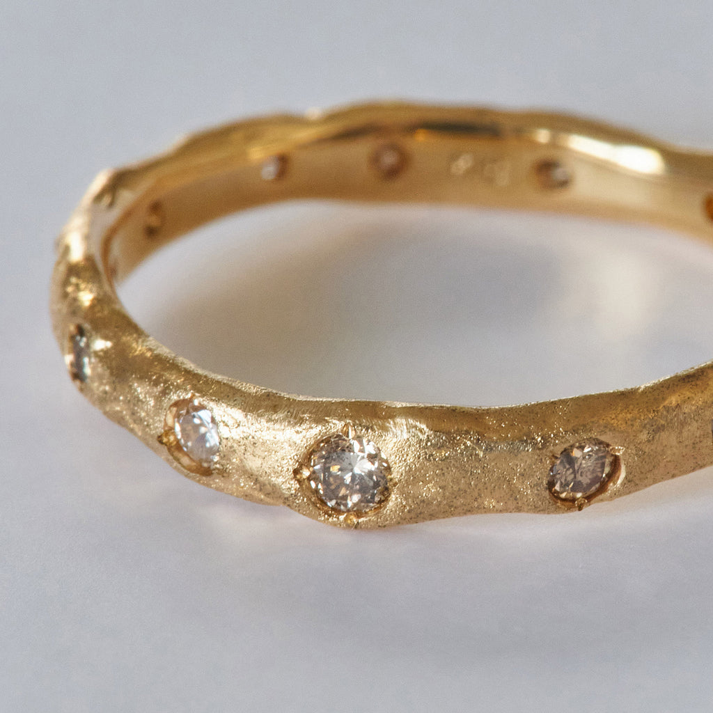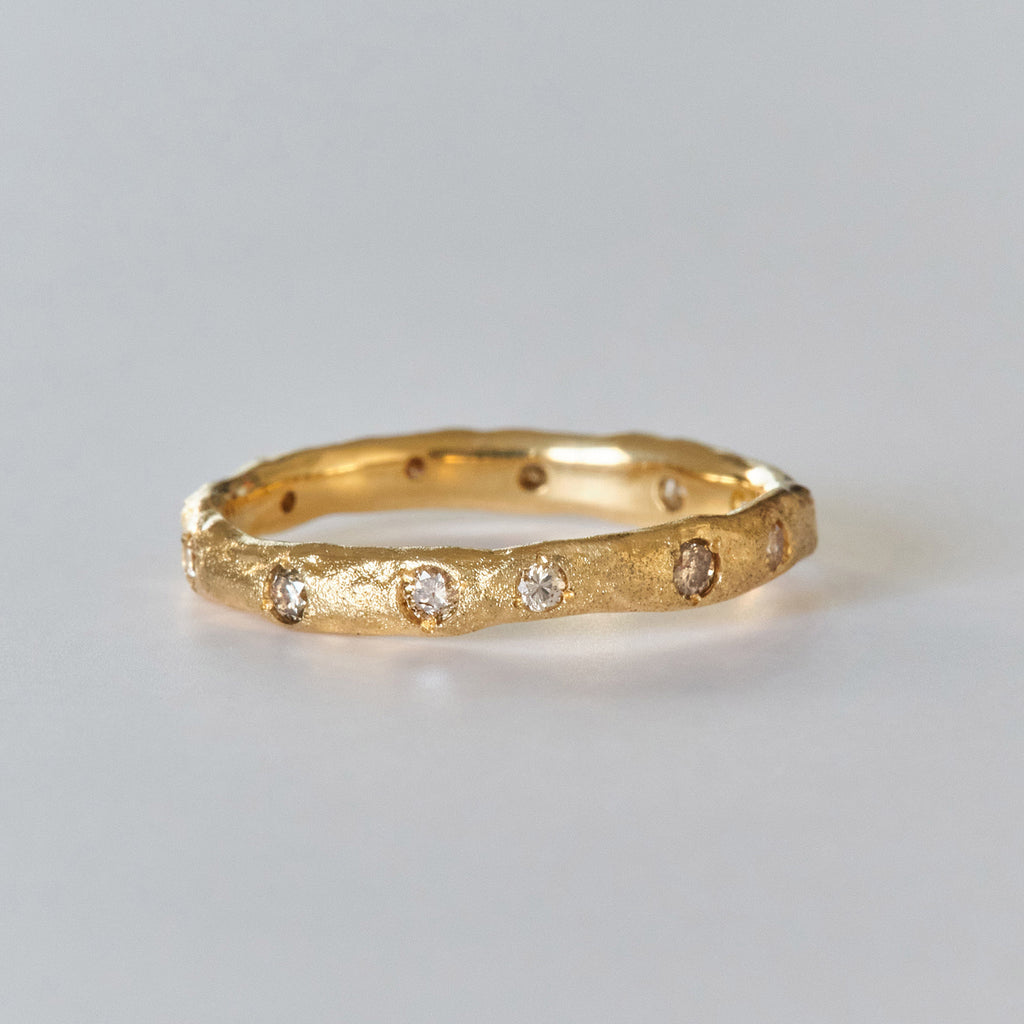 絶えず生まれ変わっていく私たちヒトと、変わることのない鉱物や金属とをつなぐように。大きさも色味も少しずつ異なる石をランダムに配しながら、緩やかに紡いだエタニティリングです。大地の色にほんのり染まったようなやさしい色合いのブラウンダイヤモンドをあしらっています。1つとして同じもののない石の表情をお楽しみください。