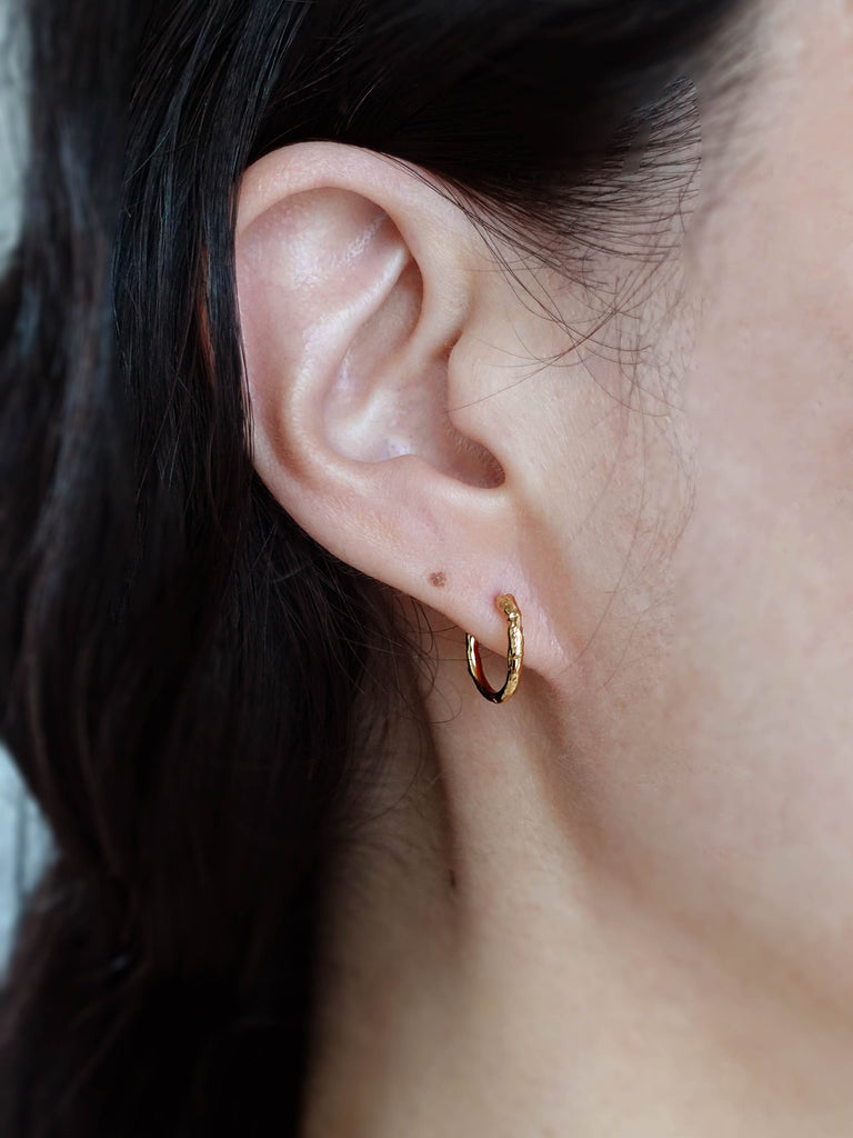 いつでも身につけたくなる、繊細ながら程よいサイズ感のスタンダードなフープピアス。微かな揺らぎが、シンプルな表情に深みを与えます。Joyaチャームを取り付けて、お好きな宝石でアレンジが可能。