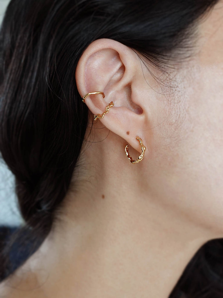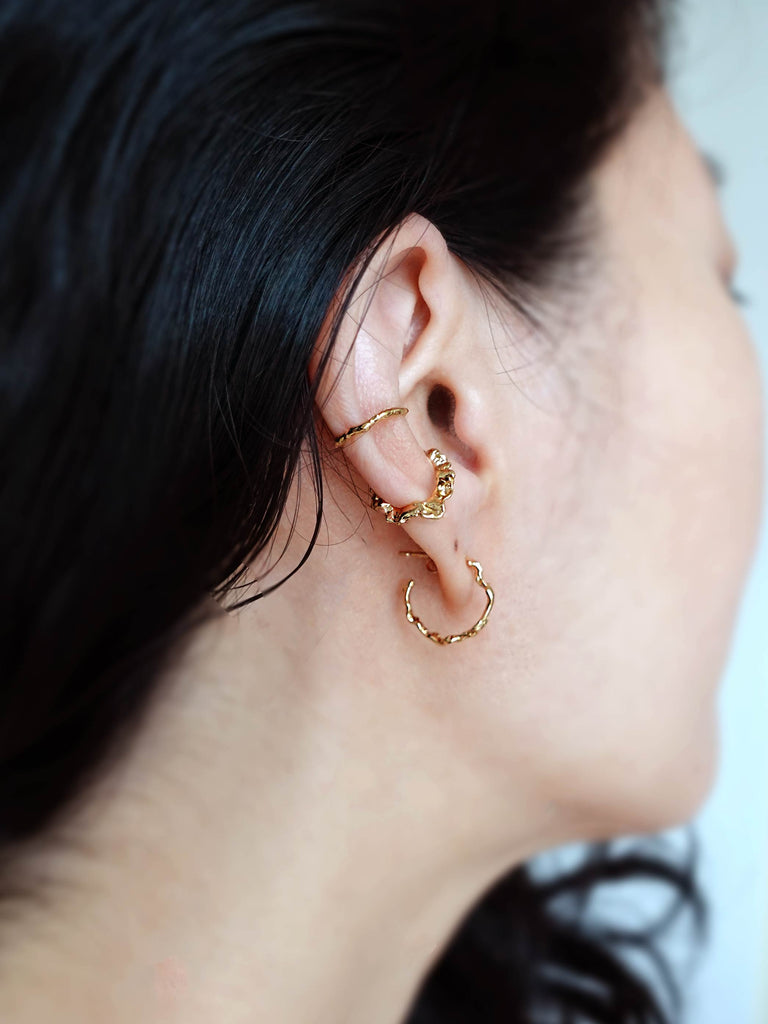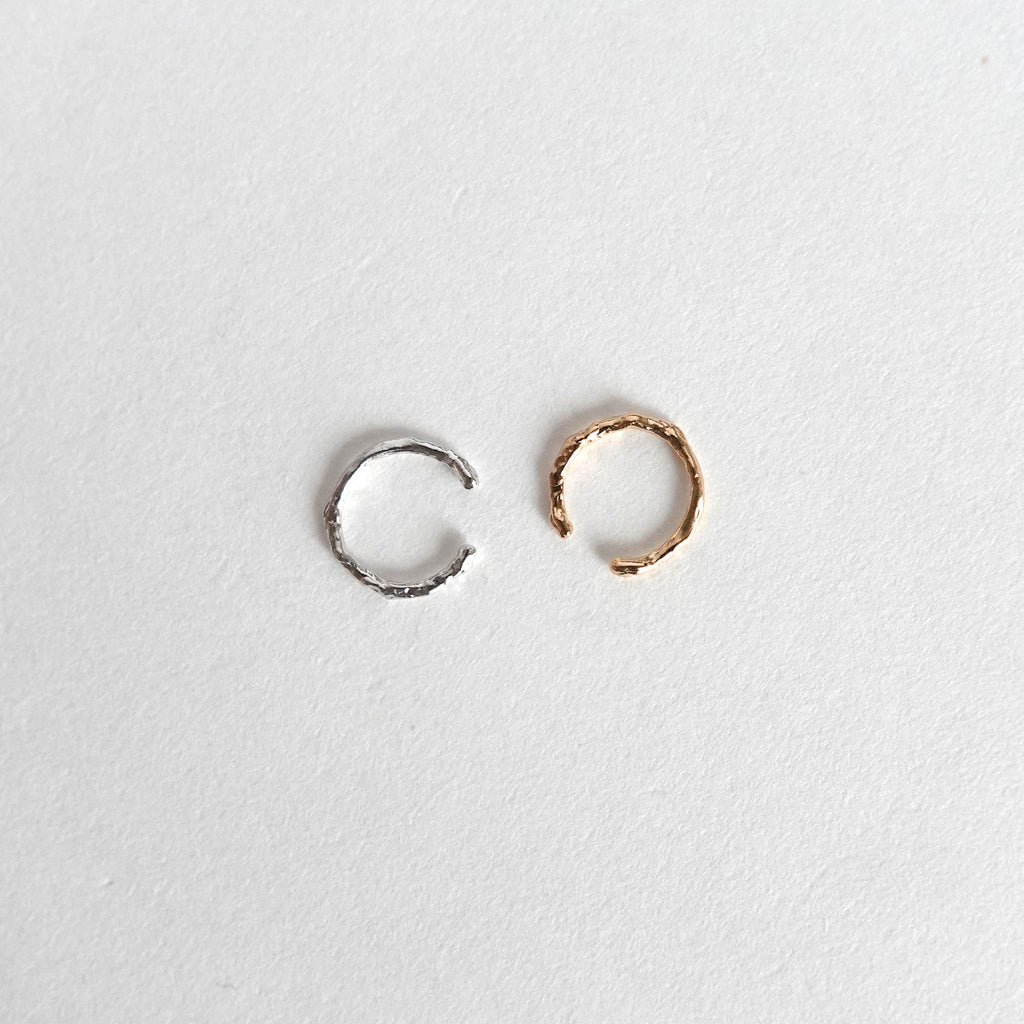 最もシンプルでミニマムなイヤーカフ。揺らめくような微かなテクスチャーがランダムに光を集めます。Joyaチャームを通して、耳元のドレスアップにも。