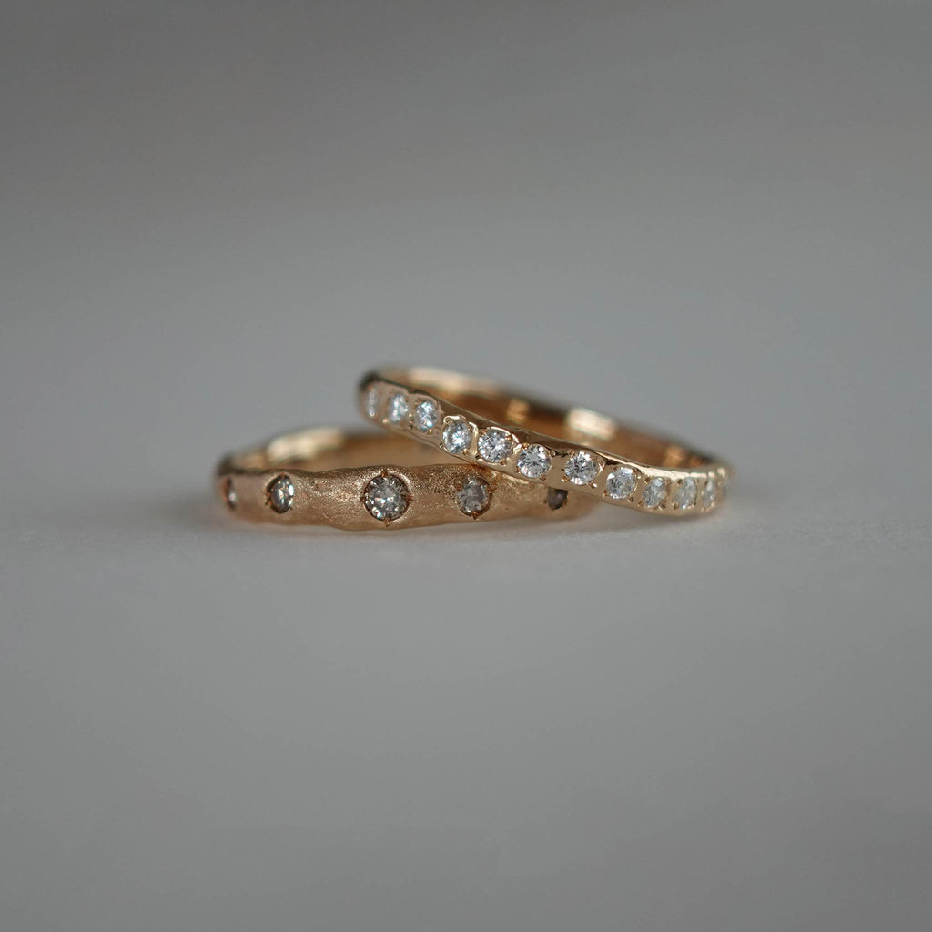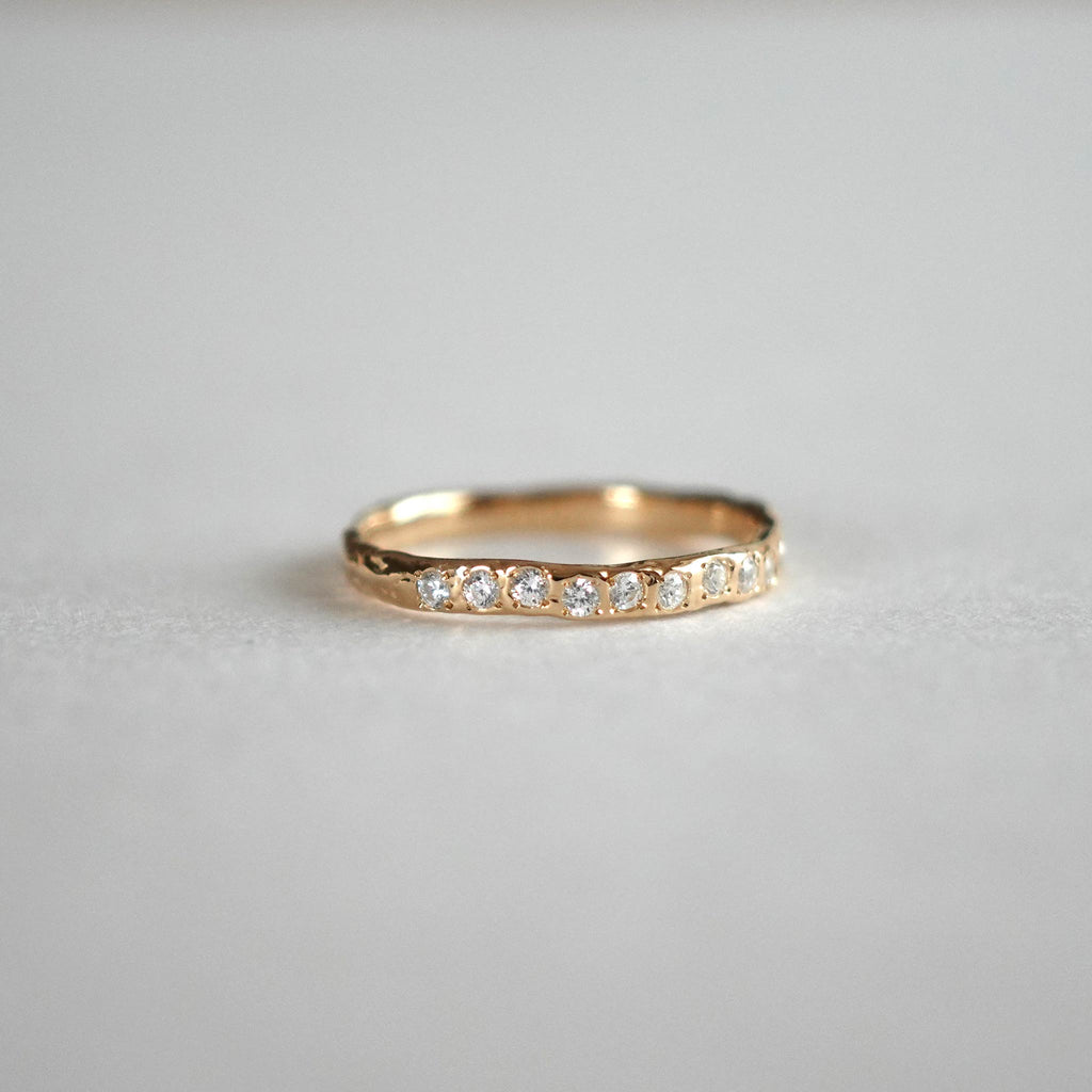 絶えず生まれ変わっていく私たちヒトと、変わることのない鉱物や金属とをつなぐように。石をライン上に配しながら、緩やかに紡いだダイヤモンドのハーフエタニティリングです。かすかに揺らめくラインが生み出すリズムをお楽しみください。